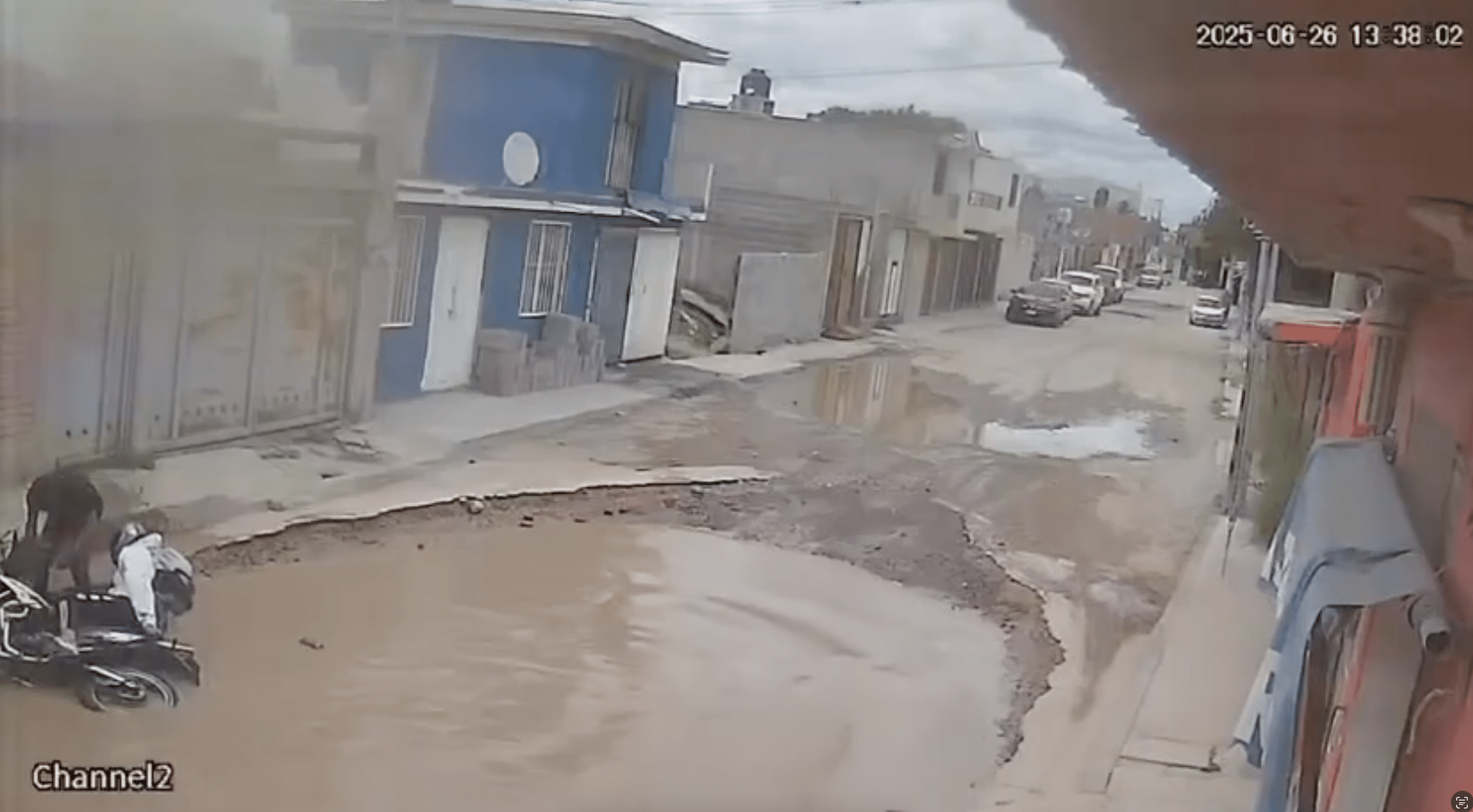 En un video difundido en redes sociales se observa el momento en que los ocupantes de una motocicleta pierden el control al intentar esquivar el gigantesco hoyanco, que ocupa gran parte del carril y está completamente lleno de agua, asemejando un chapoteadero.
