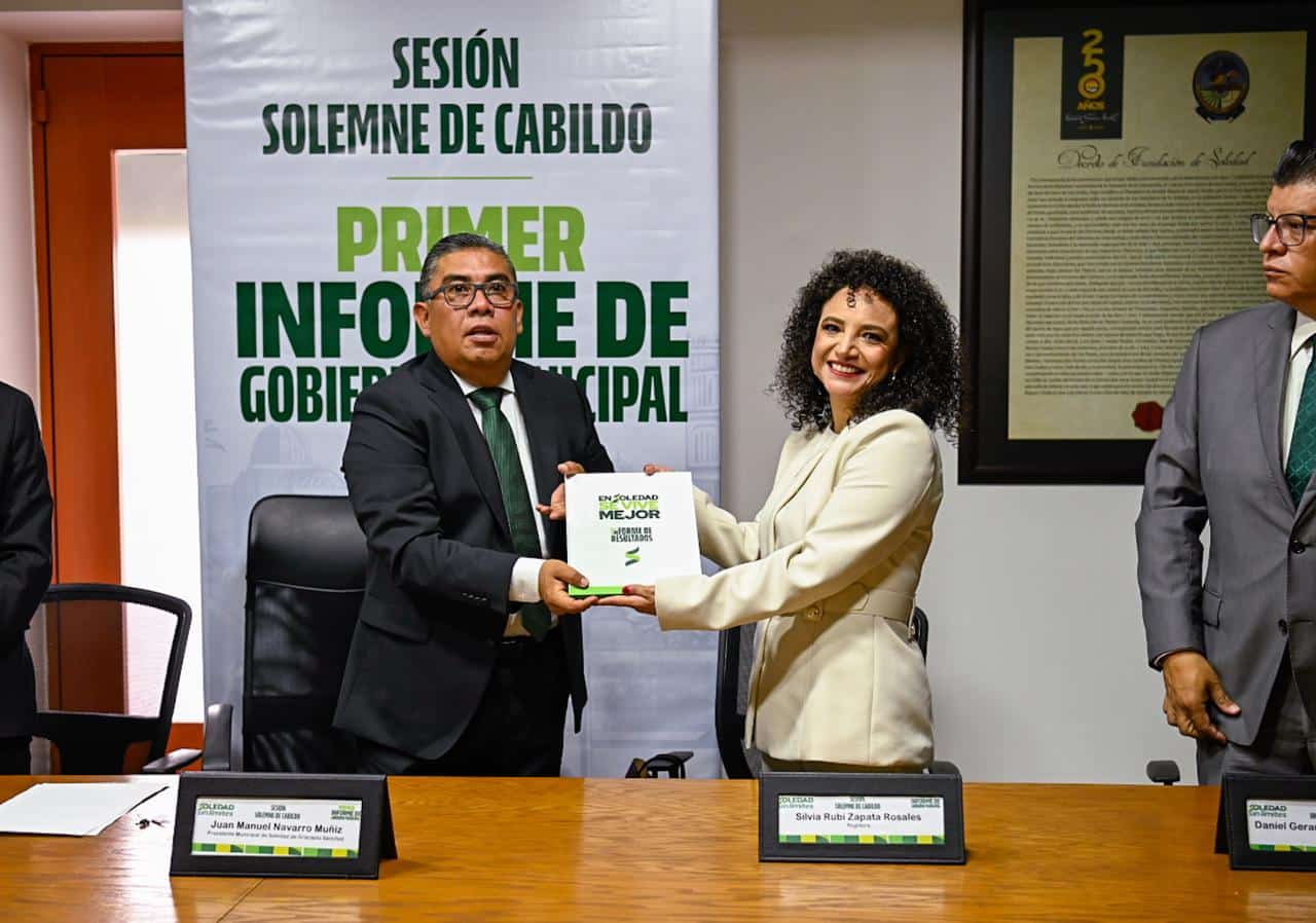 En cumplimiento a la Ley Orgánica del Municipio Libre, esta mañana, el Alcalde Juan Manuel Navarro Muñiz, entregó esta mañana a las y los integrantes del Cabildo Municipal, el documento del Primer Informe de Resultados de su administración municipal de Soledad de Graciano Sánchez, en el que se da cuenta de las acciones realizadas que, hoy, han transformado al municipio.