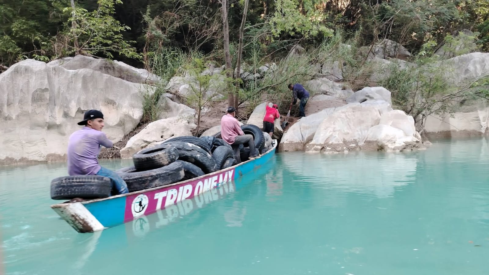 Aquismón, S.L.P.- Integrantes de Lancheros de Tamul A.C., del ejido La Morena, retiraron más de 40 llantas de la ribera y zona navegable del río Tamul durante una jornada de limpieza realizada este martes, con lo que evidenciaron la grave situación ambiental que enfrenta este importante atractivo natural.