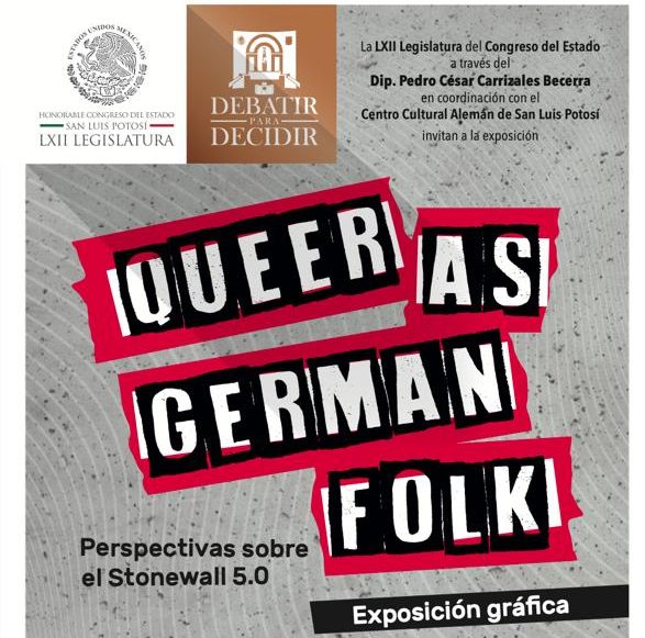A partir del próximo 13 de marzo al 14 de abril 2020, se abrirá al público de 8:00 am a 15:00 pm, la exposición “Queer as German Folk”, en las instalaciones del Congreso del Estado (Edificio Juárez No. 200), con el propósito de que la población pueda acceder de manera gratuita a un evento lúdico que está comprometido e identificado con el movimiento queer.