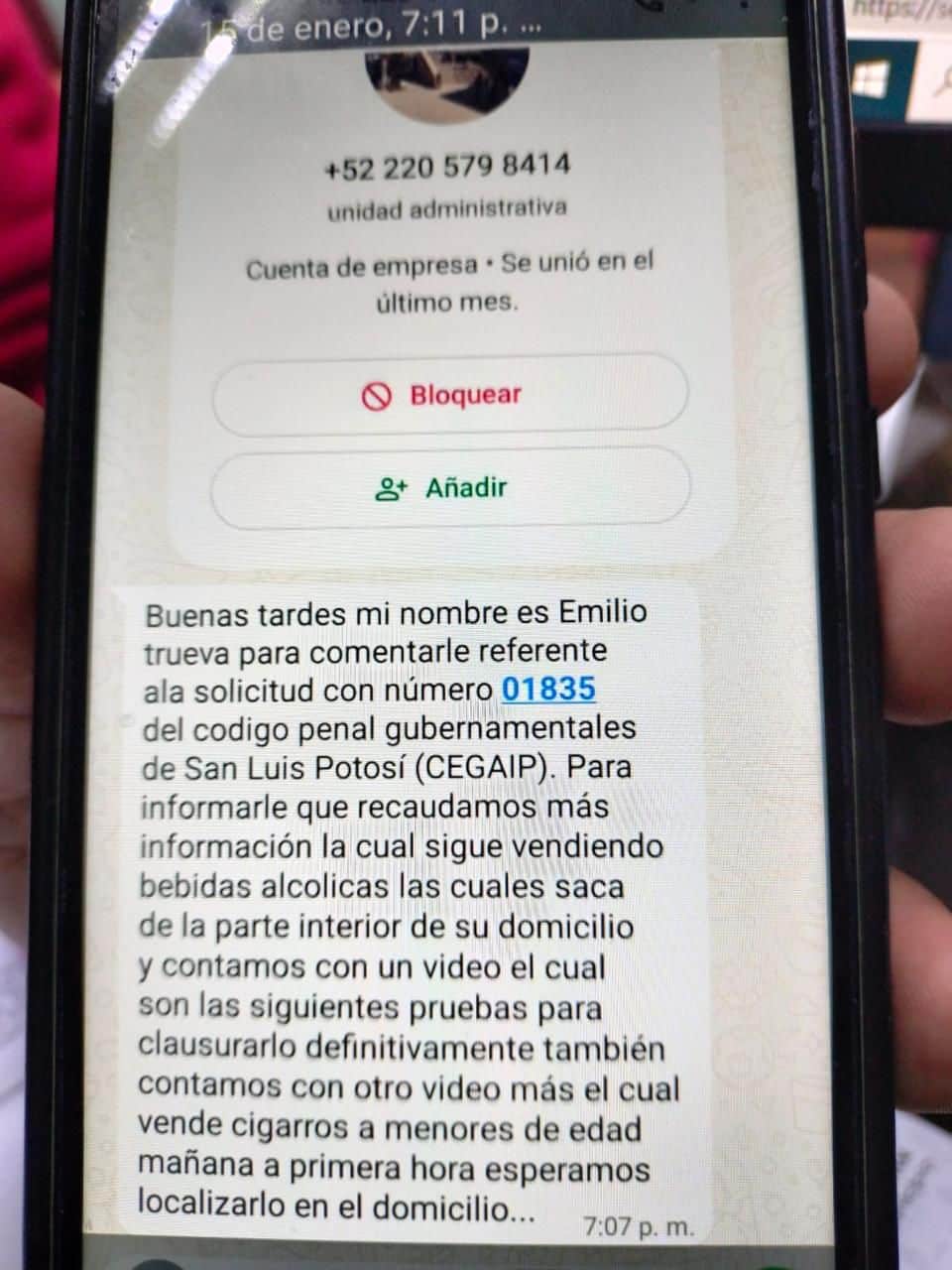 El Director de Comercio de San Luis Potosí, Ángel de la Vega Pineda, alertó a los comerciantes de la capital potosina sobre los mensajes que algunos recibieron desde un número de lada 202, correspondiente al estado de Puebla, en los que se les amenaza con sanciones o cierre de negocios. De acuerdo con los reportes, el remitente se presenta como inspector del municipio, solicitando pagos o acciones inmediatas bajo amenazas de clausura.