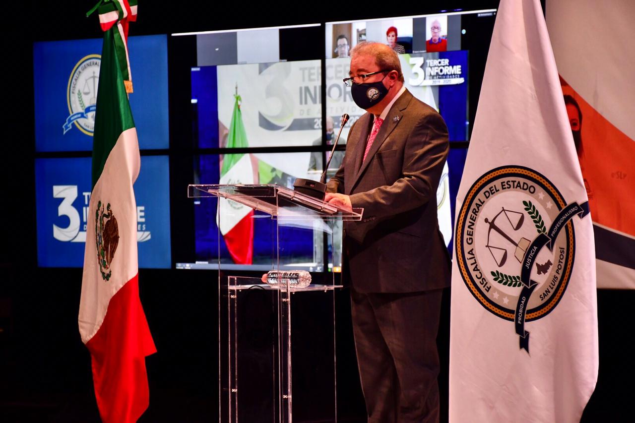 El Fiscal General del Estado de San Luis Potosí (FGESLP), Federico Arturo Garza Herrera presentó su tercer informe de actividades ante jóvenes, autoridades de los distintos órdenes de gobierno e integrantes de la sociedad civil, quienes de manera presencial o virtual escucharon los resultados obtenidos por la institución durante este 2020.