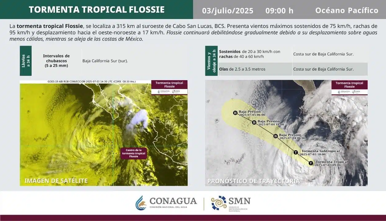 Aunque continúa debilitándose, Flossie provocará chubascos, vientos de hasta 60 km/h y oleaje elevado de hasta 3.5 metros en la costa sur de Baja California Sur. El SMN prevé que la tormenta pierda más fuerza al avanzar sobre aguas menos cálidas.
