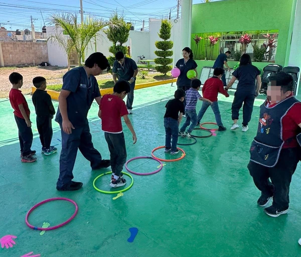 Durante la jornada se cuenta con la participación de estudiantes de la Universidad Cuauhtémoc de la carrera de Fisioterapia, quienes llevan acabo dinámicas con las niñas y niños con autismo, enfocándose en el reconocimiento del cuerpo, la coordinación y el movimiento mediante el juego, sonidos y material didáctico, que permitirá fortalecer las habilidades en coordinación motriz y conciencia del espacio.