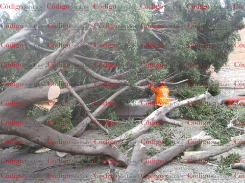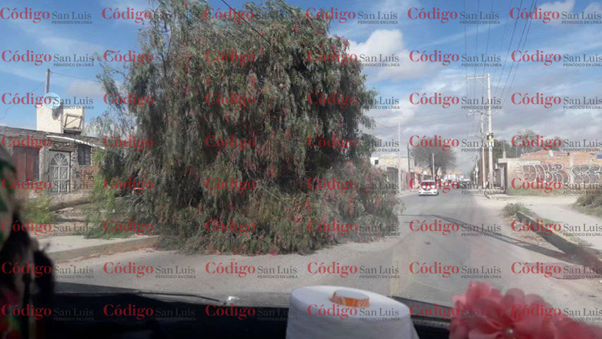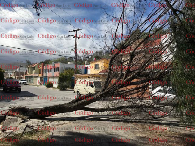 También se reporta árboles caídos en Av. Artistas cerca de calle Bocanegra; en Nereo Rodríguez Barragán entre Cascadas y Francisco de Ibarra, frente a Plaza El Dorado; en Salvador Nava frente a Plaza Tangamanga; se reporta que en lateral de Salvador Nava y Carbonera se presta abanderamiento por una lona en poste de alumbrado público, en calle Alejandrina y Rutilo una rama de árbol colapsó y obstruía la vialidad, la cual ya fue removida al camellón.