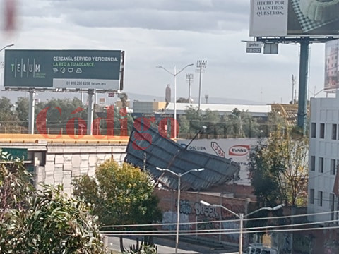Se reporta en Eje 122 próximo a Av. Comisión Federal de Electricidad poste de energía eléctrica inclinado; estructura colapsada sobre carriles centrales de 57 próximo; Cables de electricidad caídos en Zenón Fernández esquina Luis Donaldo Colosio; manta caída en Juan A. Mateos e Himno Nacional y espectacular colapsado en lateral Salvador Nava cerca a la calle 5 de Mayo.