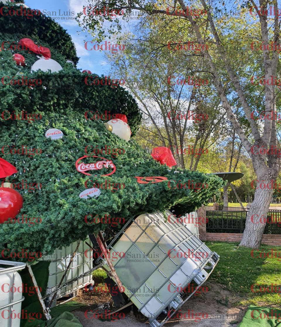 Los fuertes vientos que se dieron la mañana de este jueves 2 de enero en la capital potosina provocaron que el árbol navideño que se encuentra en la primer glorieta del Parque Tangamanga 1 se ladeara. No importo que estuviera detenida por 6 tambos de agua de aproximadamente una tonelada y media de peso cada uno. Además, provocaron que dos árboles se cayeran en la avenida Nereo Rodríguez Barragán, uno en la intersección con la calle de German Gedovius y otro cerca de la glorieta Bocanegra, a un costado del parque de Morales.