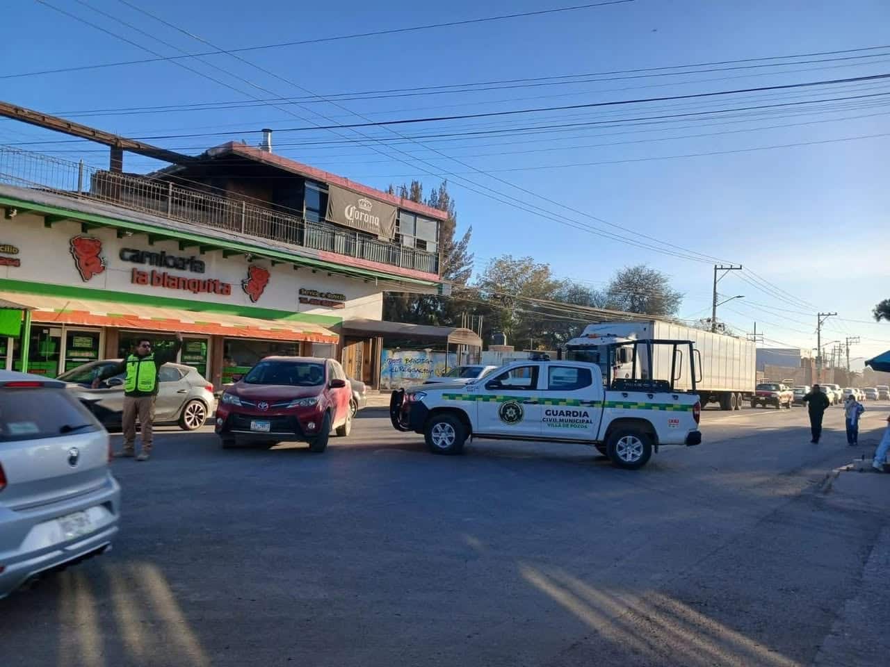 Durante el operativo, elementos de la Guardia Civil Municipal implementan un perímetro de seguridad y labores de vialidad para facilitar el acceso de los cuerpos de emergencia y mantener el orden en la zona.
