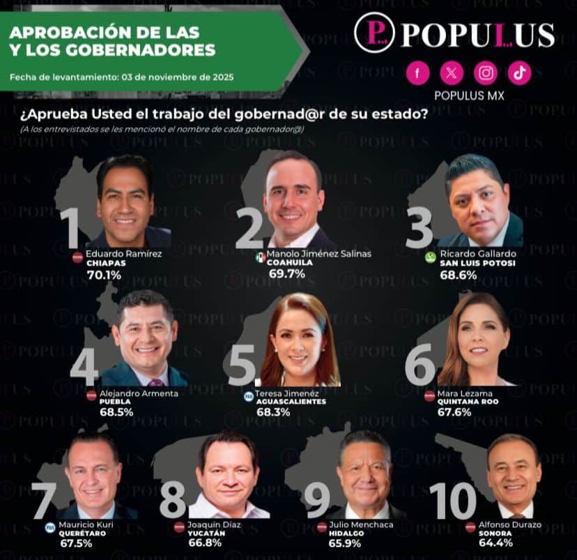 Al igual que en las encuestas que elabora mensualmente la empresa Mitofsky para evaluar los niveles de aceptación de los mandatarios estatales del país, el Gobernador de San Luis Potosí Ricardo Gallardo Cardona ocupa los primeros lugares en el ranking elaborado por Populus, casa encuestadora y medio digital.