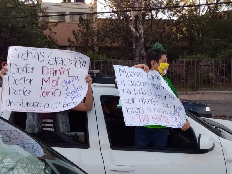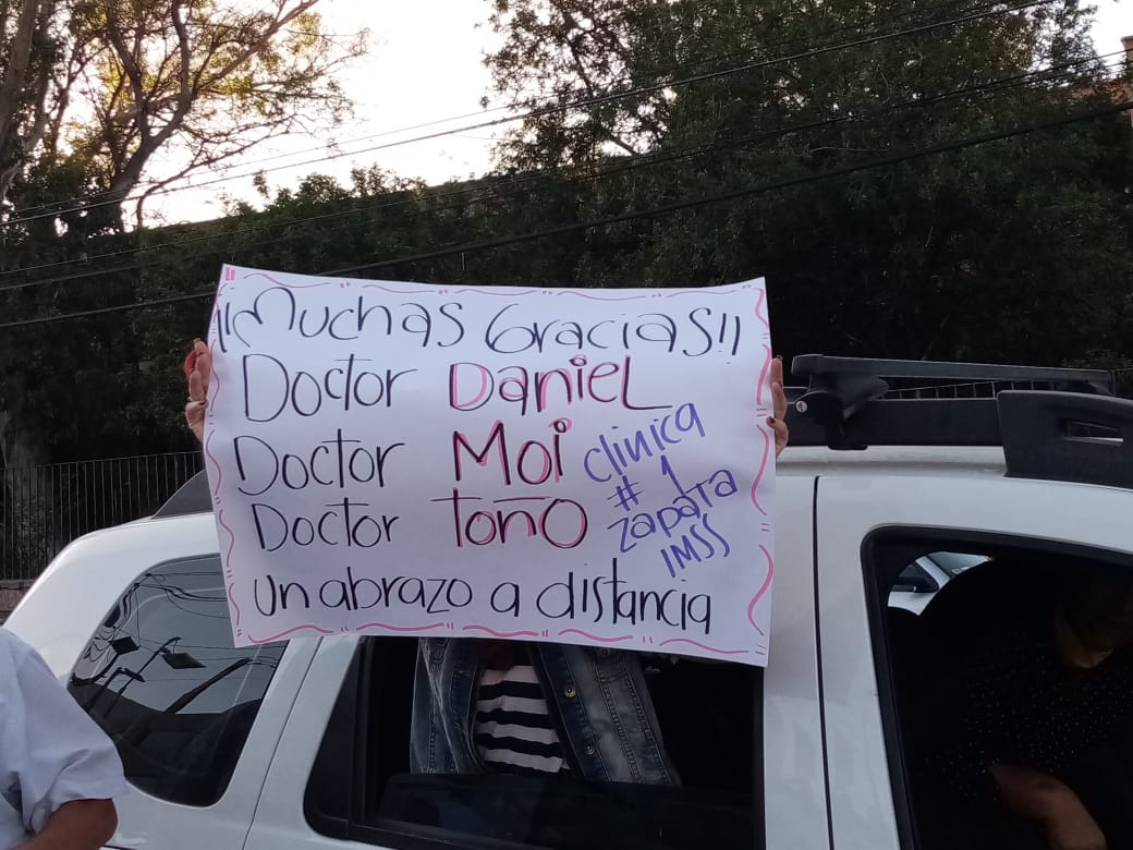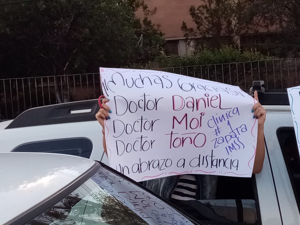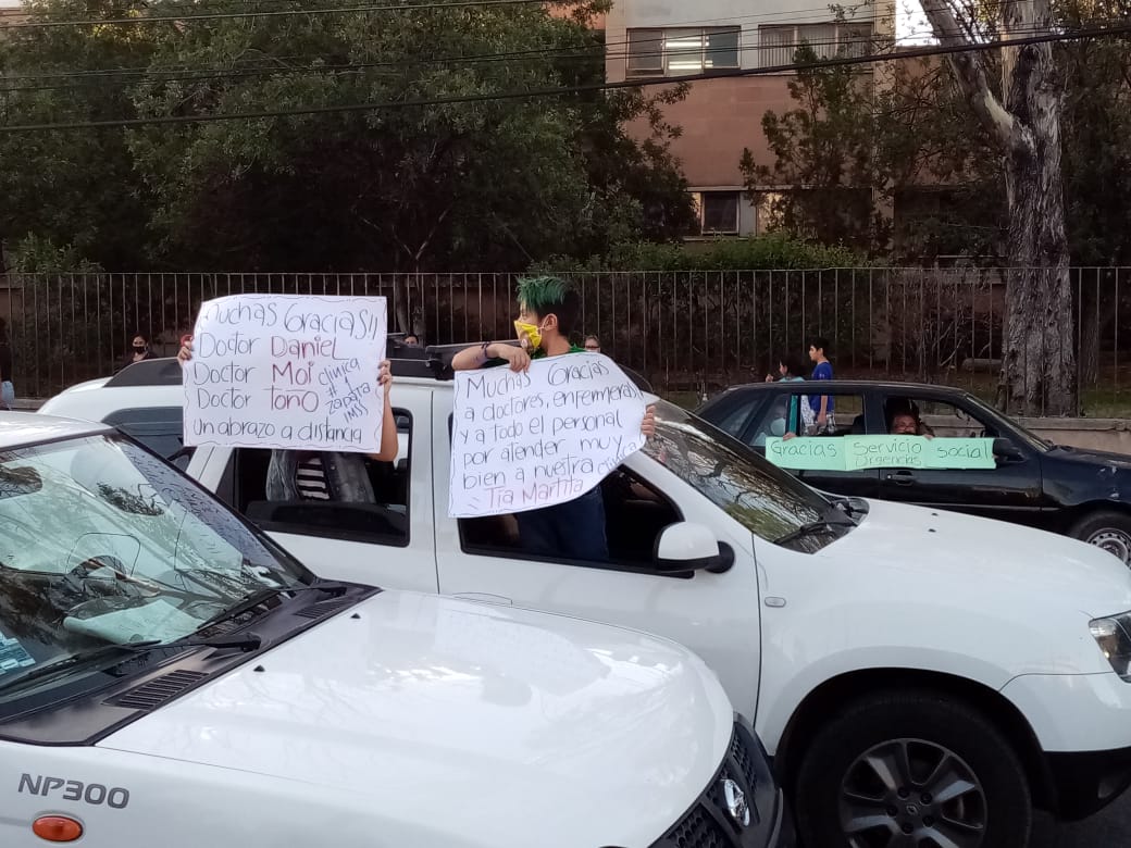 Recorrieron la calle de Nicolás Zapata en caravana y, con pancartas, vitorearon y aplaudieron a los médicos, enfermeras, camilleros y todo el personal que se encuentra en la línea de batalla contra el Covid-19.