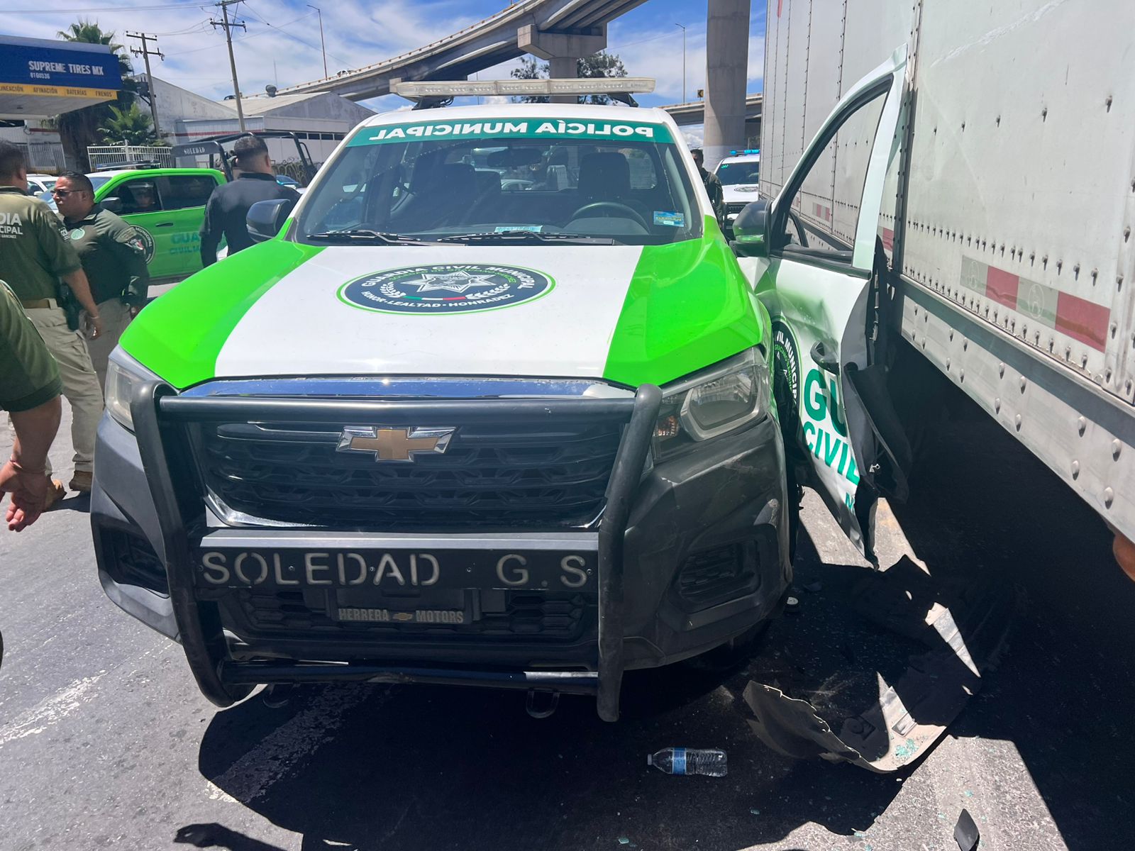 Durante el movimiento policial, el conductor del tractocamión rebasó los límites de velocidad establecidos en el Reglamento de Seguridad Vial del municipio, y derivado de ello causó un hecho de tránsito que dejó cuantiosos daños a dos patrullas de la corporación soledense, en el cruce de carretera a Matehuala y Acceso Norte, a la altura de la colonia Central de Maquinaria.