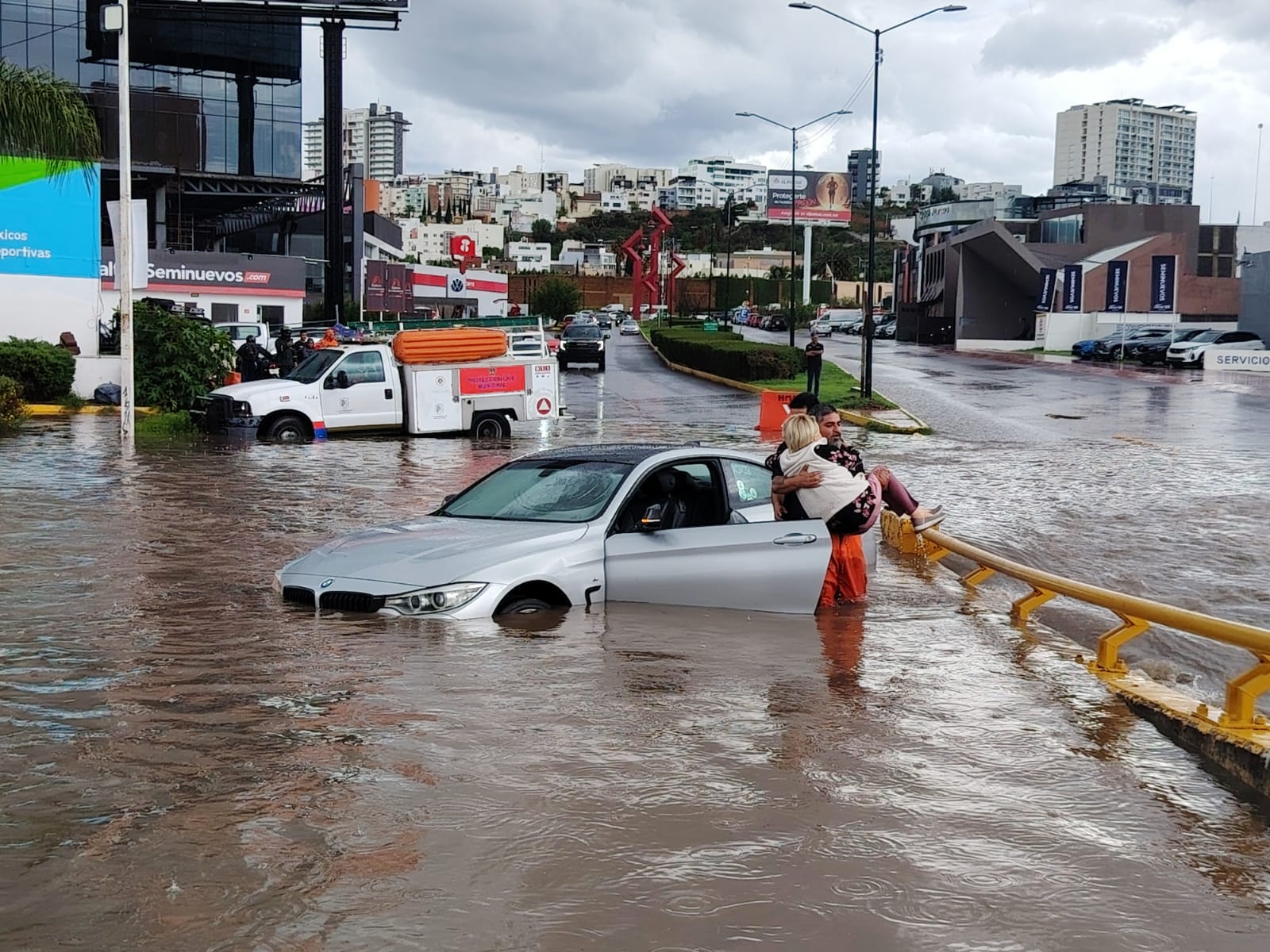 San Luis Potosí, S.L.P.- La furia de la lluvia convirtió en trampa mortal una de las zonas más transitadas de la capital: la glorieta Real Inn. Ahí, entre el rugido del agua, una mujer quedó atrapada en su vehículo, aferrada al volante mientras el nivel del líquido hacía sucumbir toda posibilidad de avanzar.