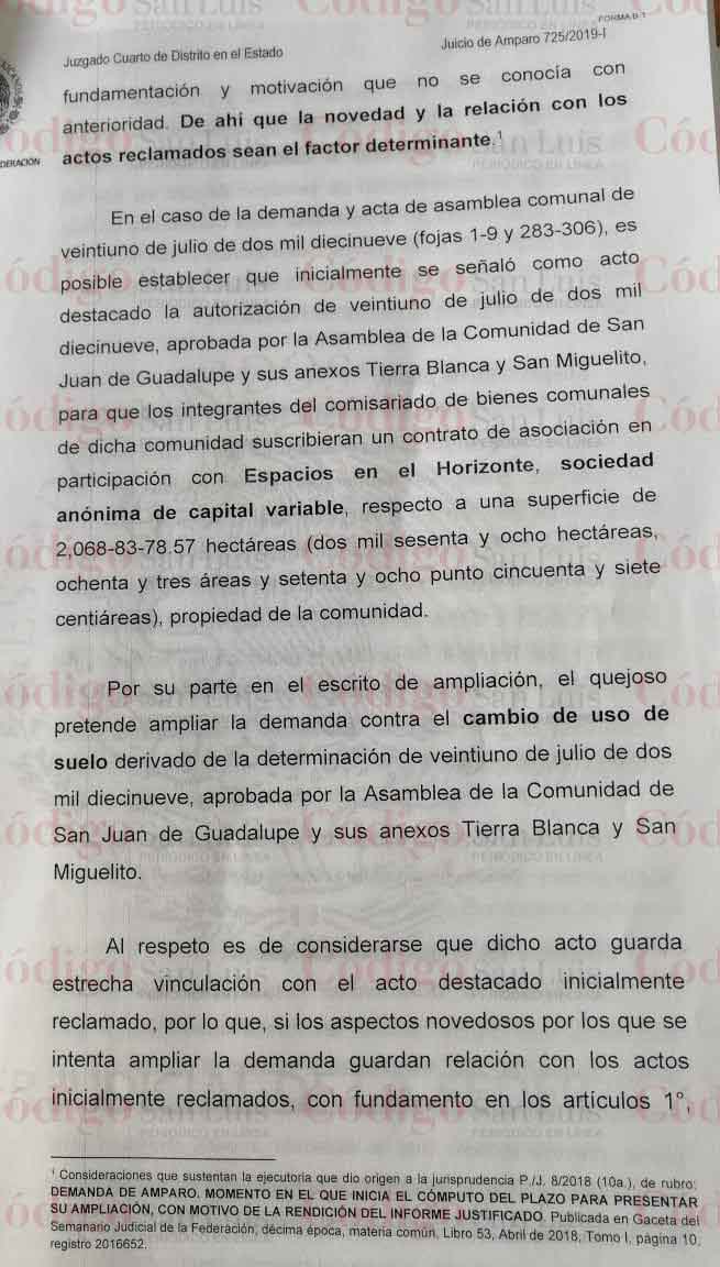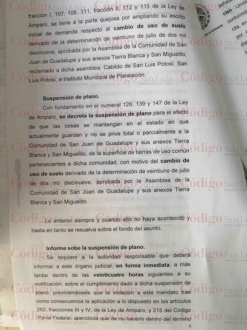 De acuerdo con el Amparo 725/2019, presentado ante el Juzgado Cuarto de Distrito, se decretó la «suspensión de plano para el efecto de que las cosas se mantengan en el estado en que actualmente guardan y no se prive total o parcialmente a la comunidad de San Juan de Guadalupe y sus anexos Tierra Blanca y San Miguelito, de la superficie de tierras de uso común pertenecientes a dicha comunidad con motivo del cambio de uso de suelo»