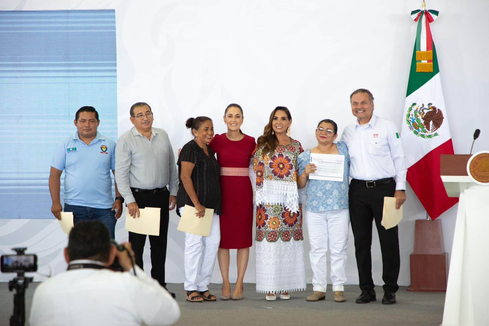 Durante la conferencia, la Presidenta Claudia Sheinbaum y el ingeniero Octavio Romero, acompañados por la gobernadora Mara Lezama, entregaron dos cancelaciones de hipoteca, un crédito Mejoravit solo para ti y una quita de más de 1 millón de pesos a un crédito hipotecario, en beneficio de familias quintanarroenses.