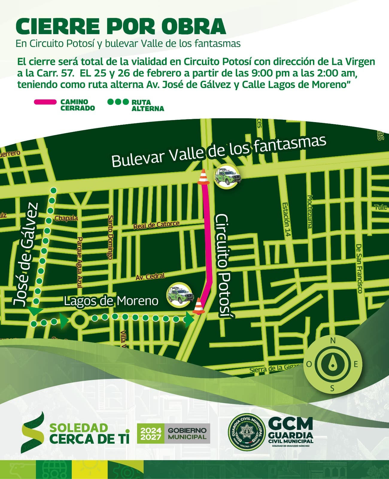 La Dirección de Seguridad Vial y Movilidad de Soledad de Graciano Sánchez informa que, con motivo de las obras de construcción del puente vehicular en Circuito Potosí Oriente y Bulevar de los Fantasmas, se realizará cierre de circulación los días 25 y 26 de febrero, en un horario de 21:00 a 02:00 horas.