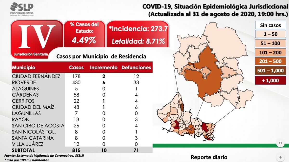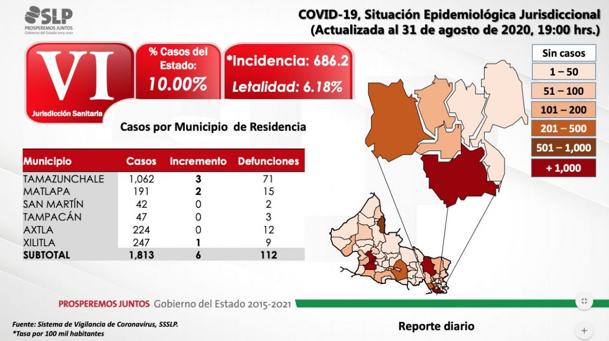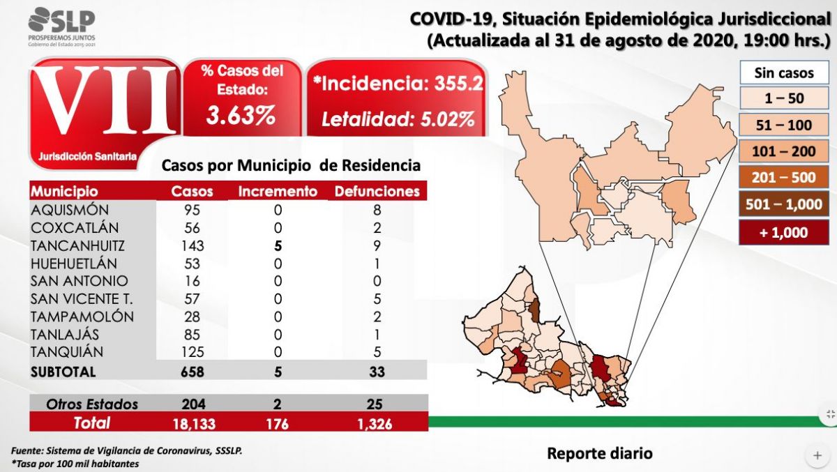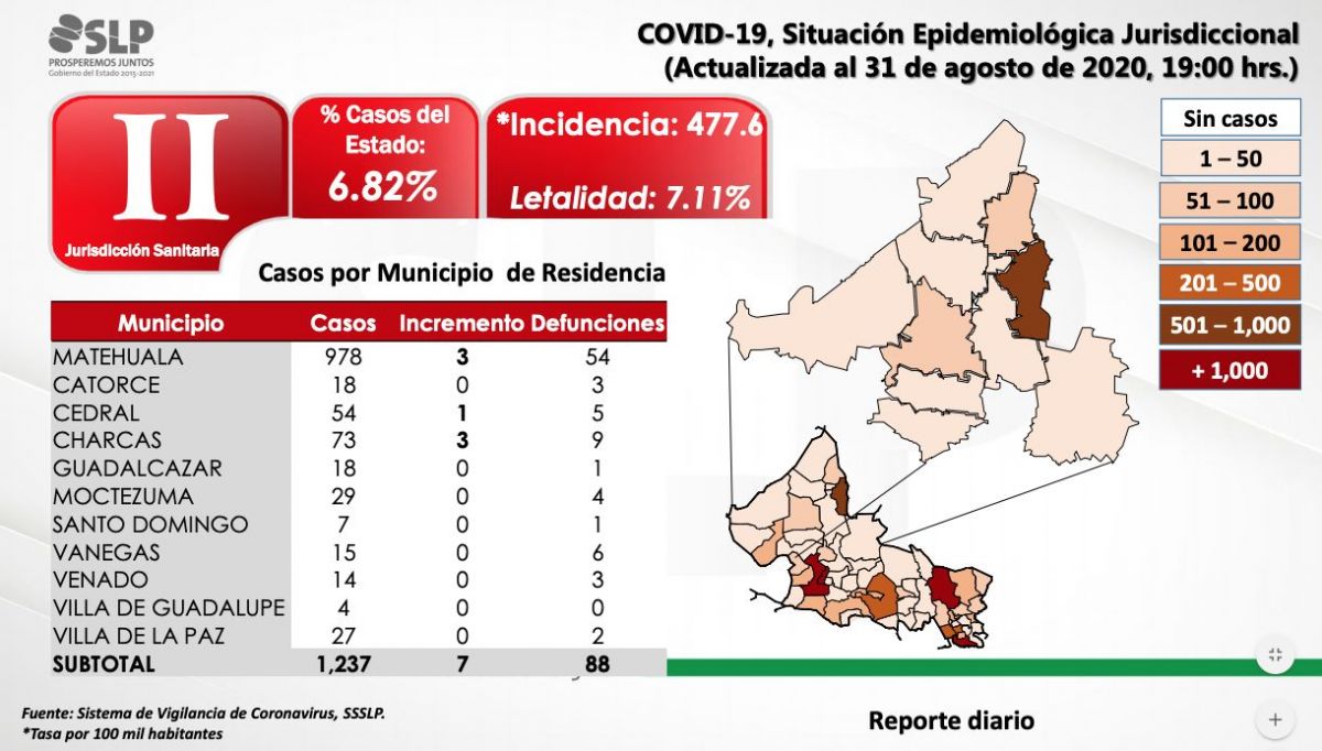 Desde el inicio de la pandemia la entidad suma 18,133 casos positivos y 1,326 defunciones. La tasa de letalidad se encuentra en 7.31 % por cada 100 contagios.