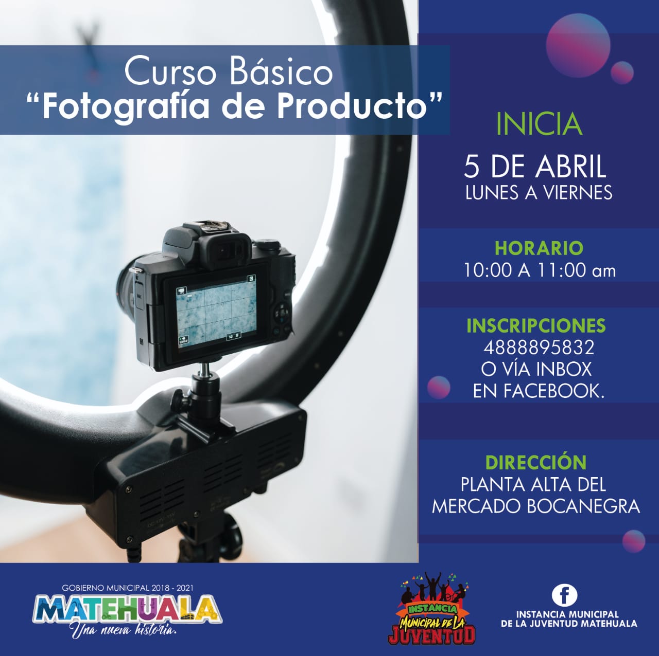 Con la finalidad de continuar brindando a través de diferentes cursos, nuevos conocimientos y herramientas para incrementar las habilidades de las personas que los cursan, el Ayuntamiento de Matehuala a través de la Instancia Municipal de la Juventud, hace una atenta invitación a personas mayores de 15 años a participar en el “Curso Básico de Fotografía de Producto”, el cual iniciara este 5 de abril de manera gratuita para los jóvenes interesados.