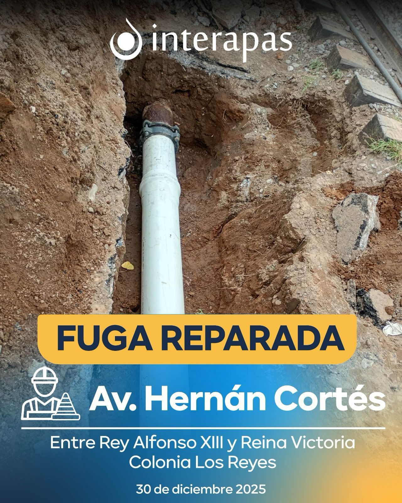 Cuadrillas de la Dirección de Operación y Mantenimiento de INTERAPAS atendieron de manera oportuna una fuga de agua potable registrada en la avenida Hernán Cortés, entre las calles Rey Alfonso XIII y Reina Victoria, en la colonia Los Reyes.