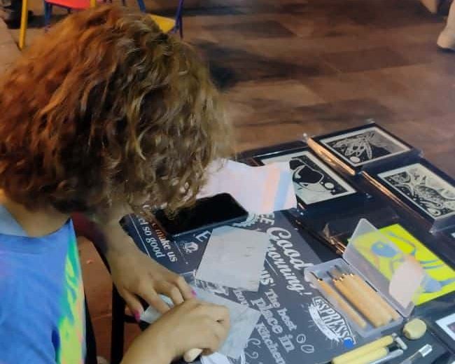 quien guía a los participantes en el aprendizaje de esta técnica gráfica. El grabado en linóleo consiste en tallar sobre una plancha con gubias o herramientas de corte, para después entintar la superficie y transferir la imagen a papel mediante presión manual o con prensa.
