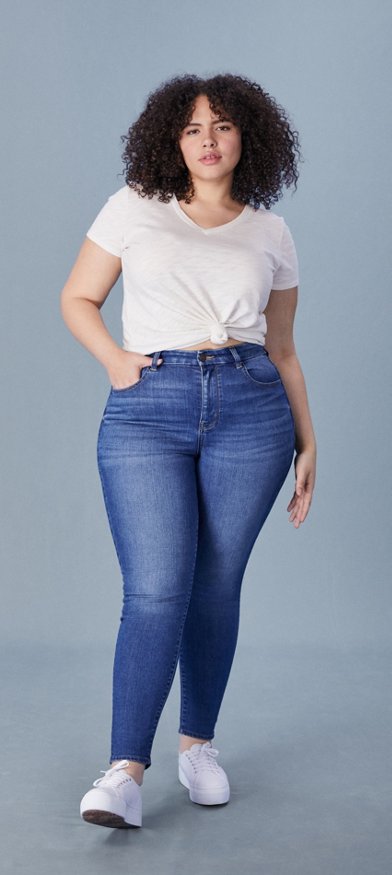 Con este tipo de cuerpo necesitas unos jeans con cintura alta, corte retro que ayude un poco más a equilibrar y ayudar a dar ajuste y crear volumen en las zonas correctas, con piernas un poco amplias pero con ajuste en la cadera.