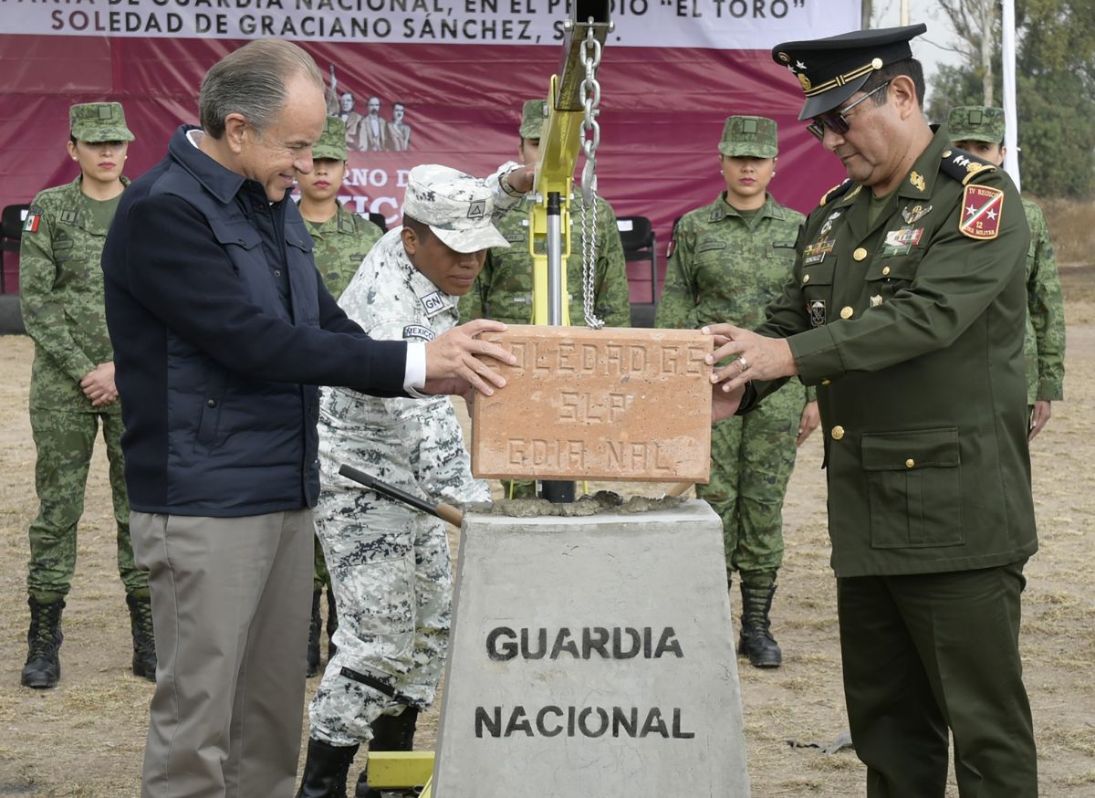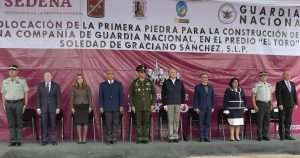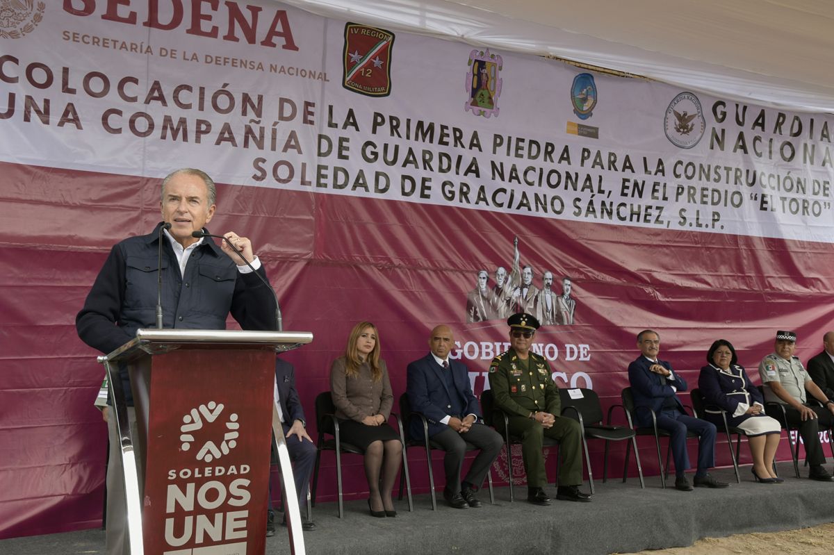 Soledad de Graciano Sánchez, S.L.P – Con motivo de la colocación de la primera piedra de la Compañía de la Guardia Nacional (GN) en este municipio que atenderá la zona metropolitana de la entidad, con una inversión de 25 millones de pesos, el Gobernador del Estado, Juan Manuel Carreras López, con la presencia del Comandante de la XII Zona Militar, Guzmar Ángel González Castillo, y el inspector general y coordinador estatal de la GN en San Luis Potosí, Martín Vázquez Orozco, refrendó el compromiso de sumar esfuerzos por la construcción de la paz y la seguridad.