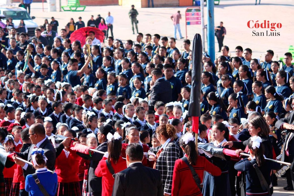 Tras su discurso, la estudiante Ana Victoria, del colegio Arete de la capital fue la encargada de dirigir el Juramento a la Bandera, el cual fue seguido por todos los pequeños al unísono. Una vez que terminó la niña, con bandera en mano, el gobernador Juan Manuel Carreras tomó protesta. Para finalizar el evento, los niños entonaron el “Canto a la Bandera”, con letra de Rafael López, y música del potosino Julián Carrillo.