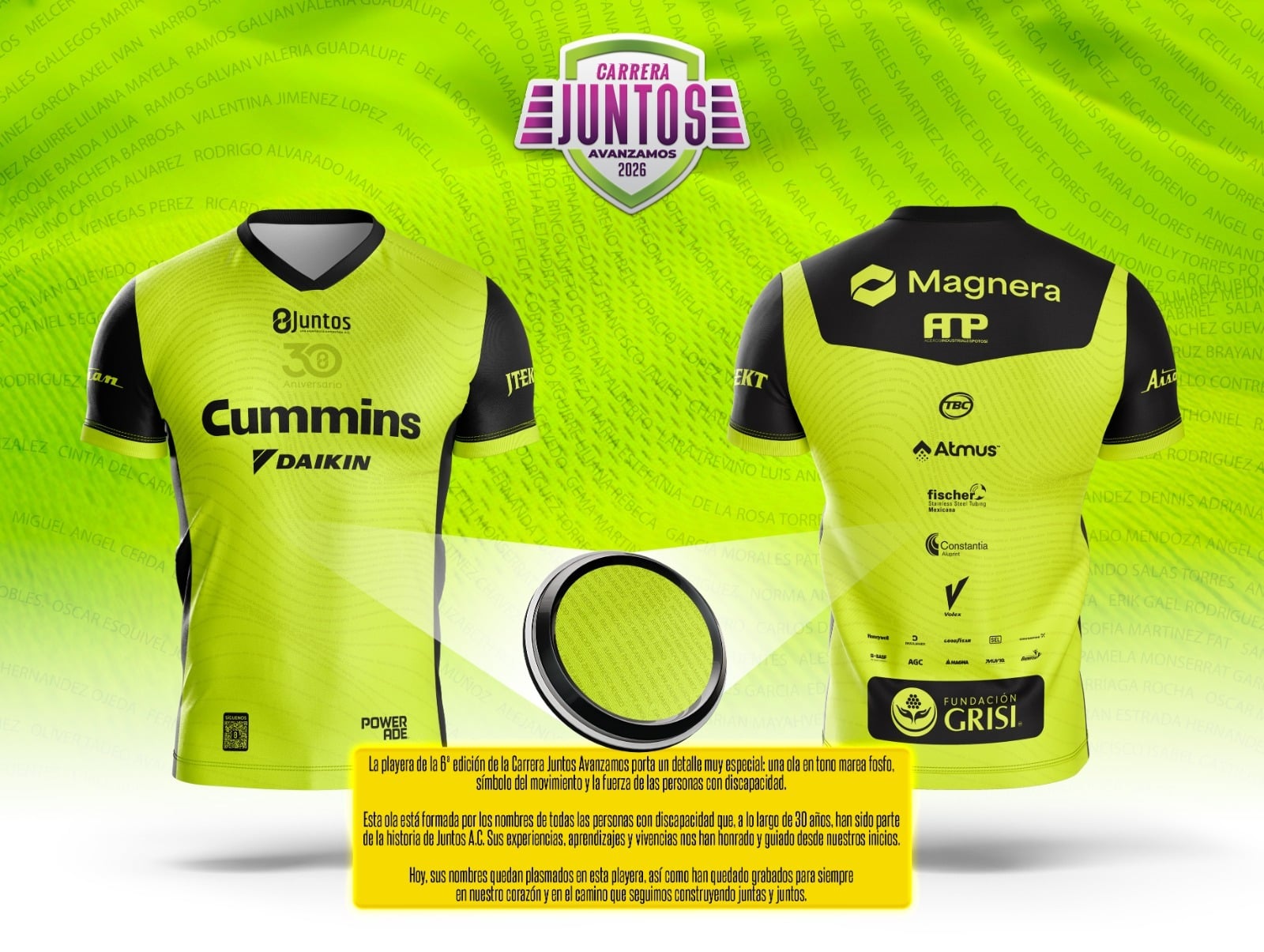 El elemento central del diseño es una ola que representa la “marea fosfo”, símbolo del movimiento, la fuerza colectiva y la visibilidad de las personas con discapacidad. Esta ola está conformada por los nombres de todas aquellas personas con discapacidad que, a lo largo de 30 años, han sido parte fundamental de la historia de Juntos A.C., aportando sus vivencias, aprendizajes y experiencias.