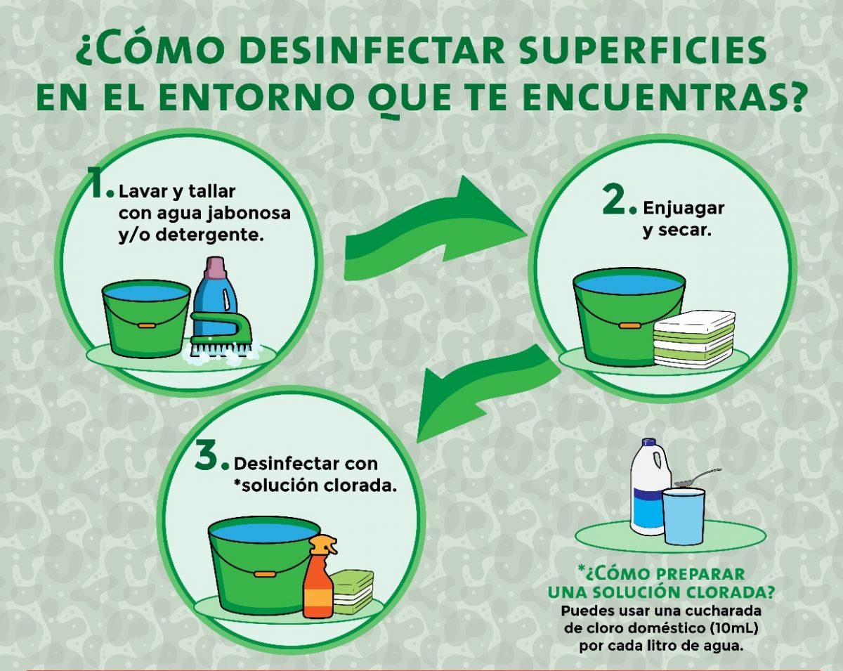 En el caso de la desinfección de espacios de uso común y superficies, se recomienda lavar y tallar con agua jabonosa y/o detergente; enjuagar, secar y desinfectar con una solución clorada que debe prepararse con 10 mililitros de cloro doméstico por cada litro de agua.