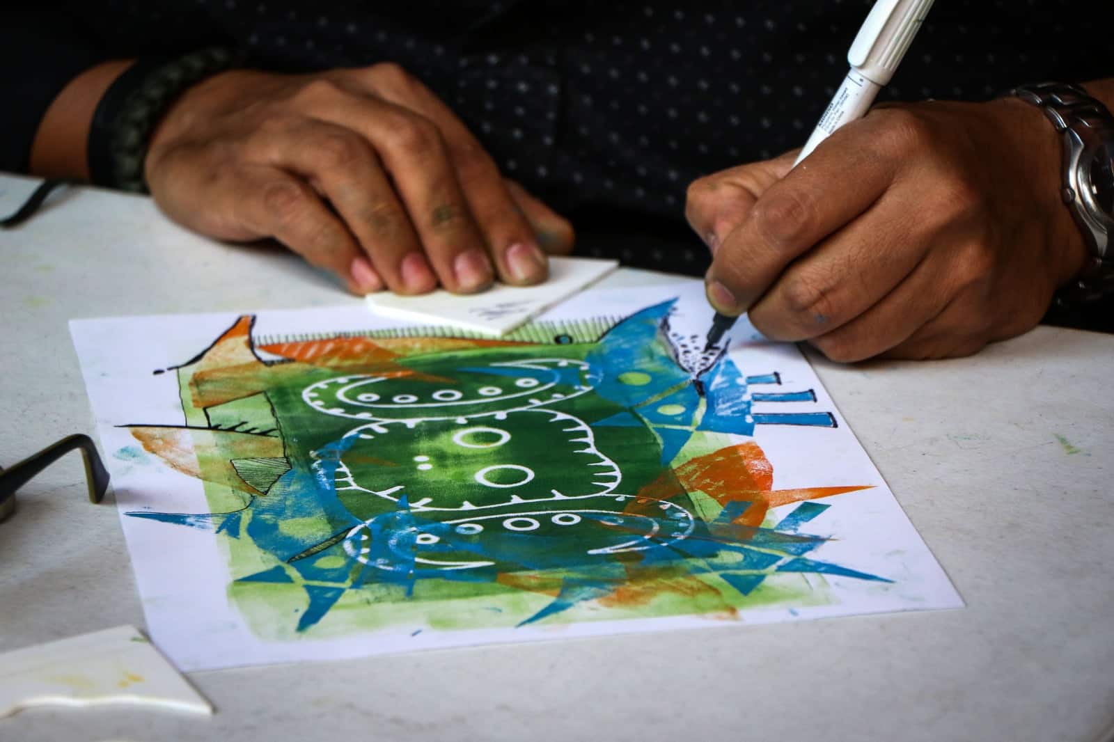Los artistas Josué «Hommie» Martínez, Montserrat Escudero (Momo) y Paulina Lucciotto, llevan a cabo el “Taller de grabado público”, en el que el público potosino de cualquier edad puede aprender técnica de grabado y llevarse sus trabajos a casa, en un ejercicio de experiencia artística que se desarrolla en la arquería de Palacio Municipal.