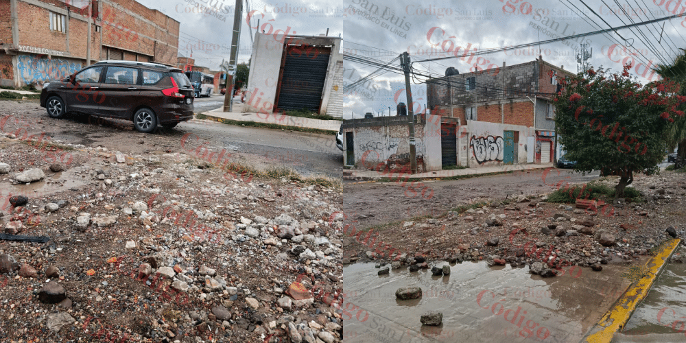 San Luis Potosí.– Tras las intensas lluvias registradas el pasado fin de semana, la avenida Juárez, en la colonia Satélite, presenta un severo colapso debido a la acumulación de tierra y rocas de gran tamaño arrastradas por la corriente pluvial.