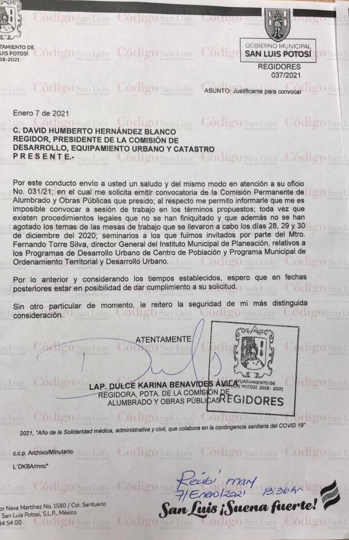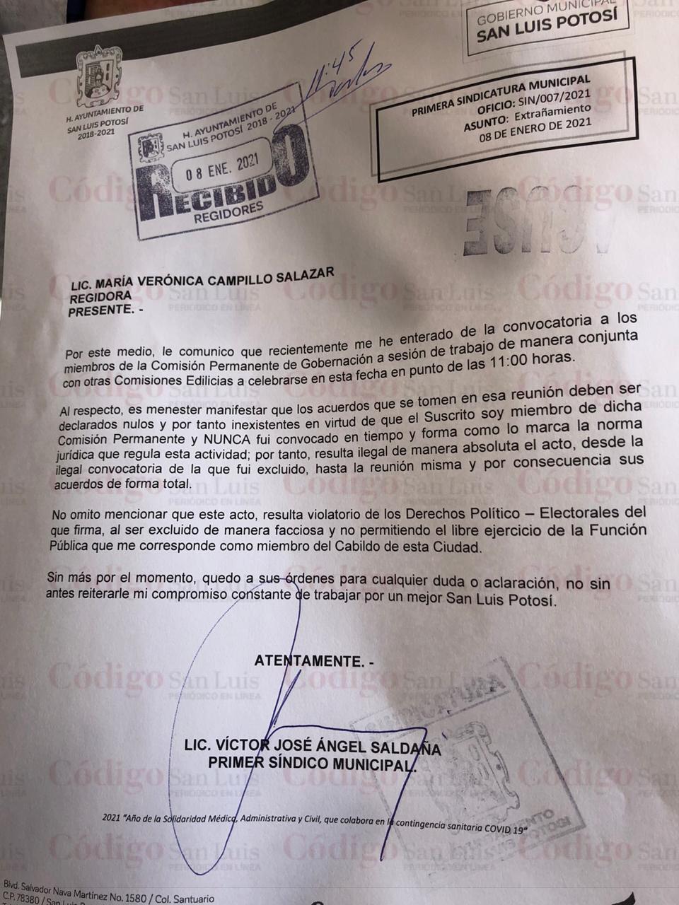 El síndico capitalino, Víctor José Ángel, entregó un escrito a la regidora Verónica Campillo, presidenta de Gobernación, para reiterarle que cualquier acuerdo que se pudiera tomar en la sesión de este viernes resultaría ilegal pues no se convocó en tiempo y forma a los integrantes de las comisiones correspondientes.