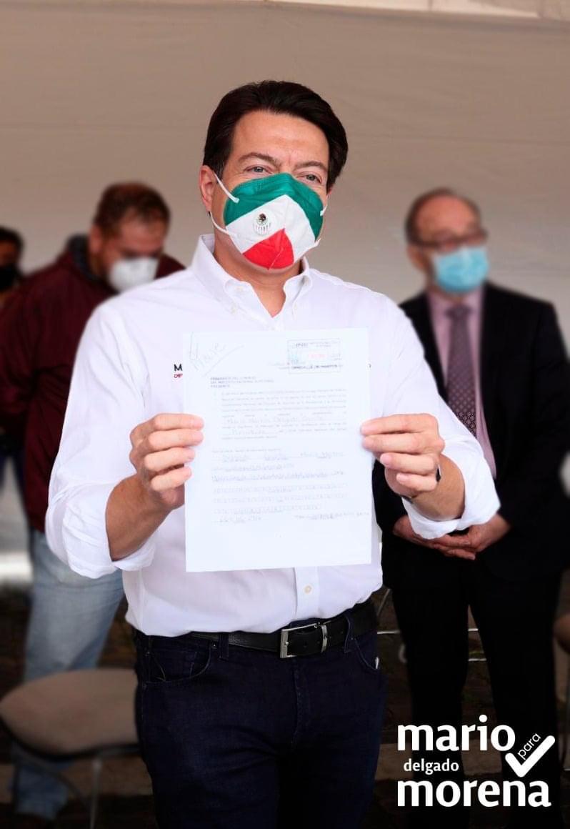 Mario Delgado entrego ante el INE su solicitud de registro para la elección de presidencia nacional de su partido.