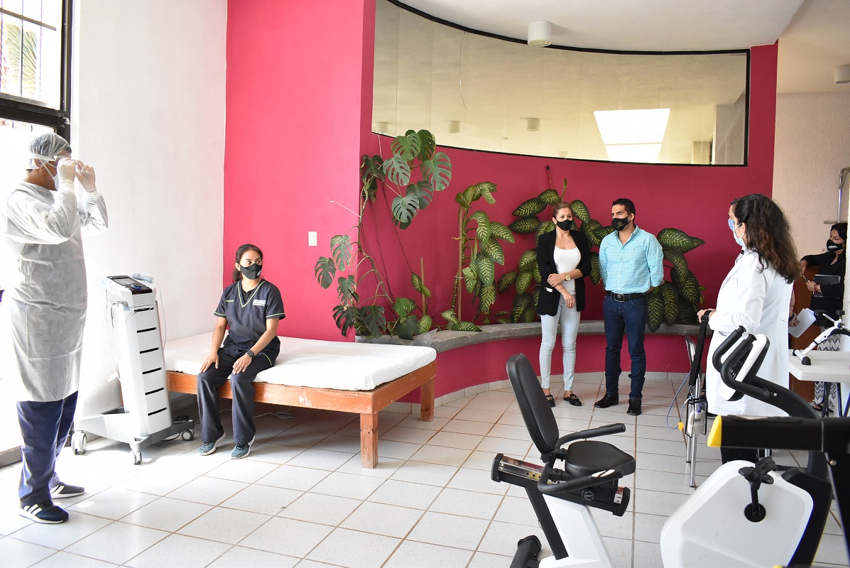 Se brindará servicio en rehabilitación pulmonar con terapia física además de terapia Psicológica como complementación para el paciente. Éste espacio está equipado con cama individual para hacer ejercicios, rampa con escalera, caminadora, bicicleta estática, un compresero, aparato de electro estimulación, se adquirieron productos para complementar la atención como cubrebocas N95 de alta calidad, gorro cubre cabello, batas desechables, lentes tipo goles, un oximetro de palma para la aplicación de prueba y monitoreo constante de la oxigenación del paciente, pedales de mano y cánula de oxigeno nasal, además de que se cuenta con un tanque de oxigeno para alguna emergencia que se requiera en el paciente durante su terapia.