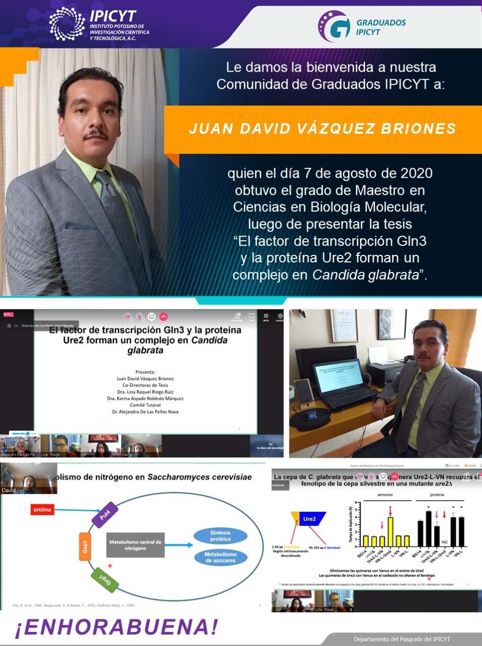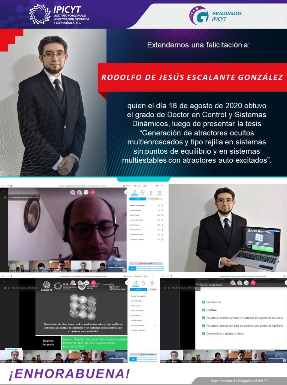 El Instituto Potosino de Investigación Científica y Tecnológica, A.C. (IPICYT) adaptado en la Nueva Normalidad, creó un protocolo de graduación virtual que a la fecha ha permitido que 29 estudiantes de maestrías y doctorados del Programa de Posgrados 2020, hayan realizado sus exámenes de grado a distancia con calidad y eficiencia.