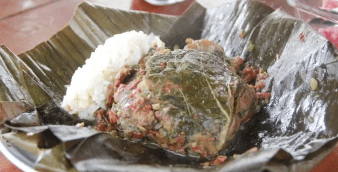 Se trata de un platillo estilo tamal que se envuelve en hoja de plátano y lleva ingredientes principales como carne de cerdo, plátano verde, tomate, cebolla, chile dulce y serrano, manteca, y la hierba santa, conocida en la región como momo o mumu.