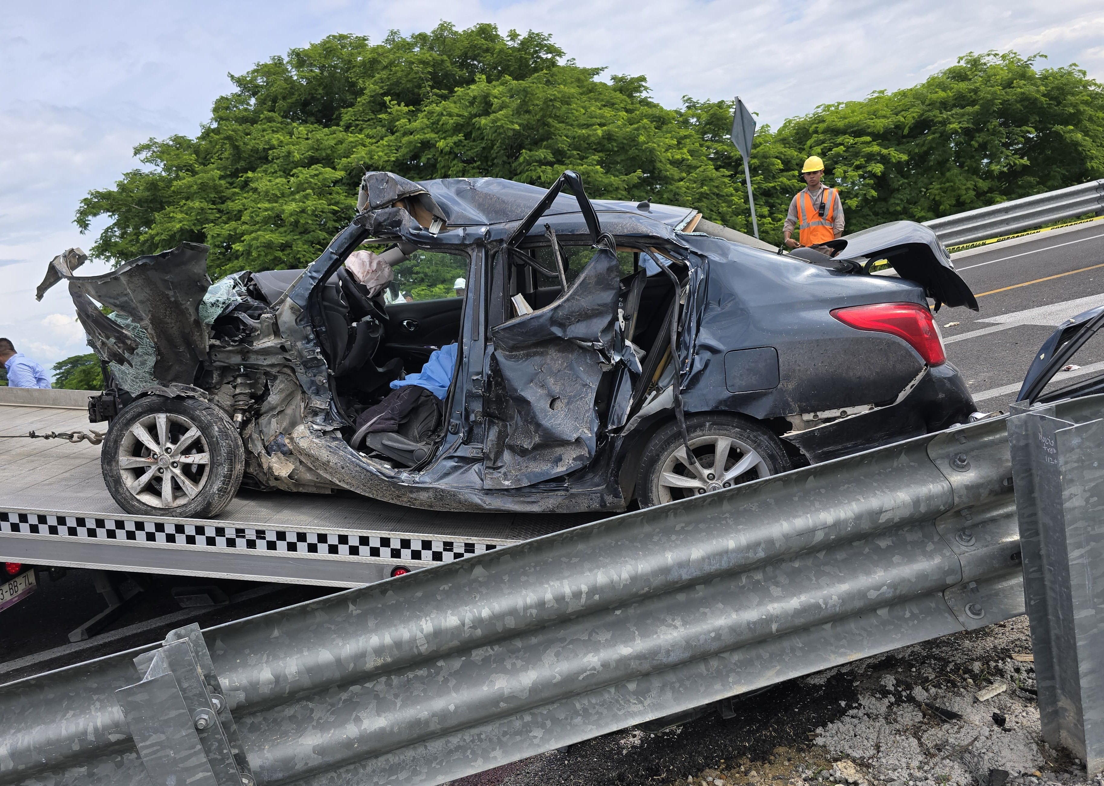 Del fuerte impacto, el Versa chocó contra la valla de contención. Una de sus ocupantes salió proyectada de la unidad, quedando sobre la cinta asfáltica; lamentablemente, falleció en el lugar. El conductor del vehículo quedó prensado dentro de la unidad, sin vida. Otros dos jóvenes resultaron heridos.