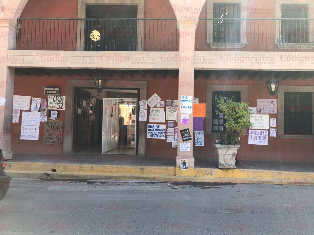 Al medio día de este lunes se dieron cita a las puertas de la Presidencia Municipal de Matehuala un grupo amplio de feministas a las que gritaban consignas y pedían a las autoridades se les escuchara su peticiones.