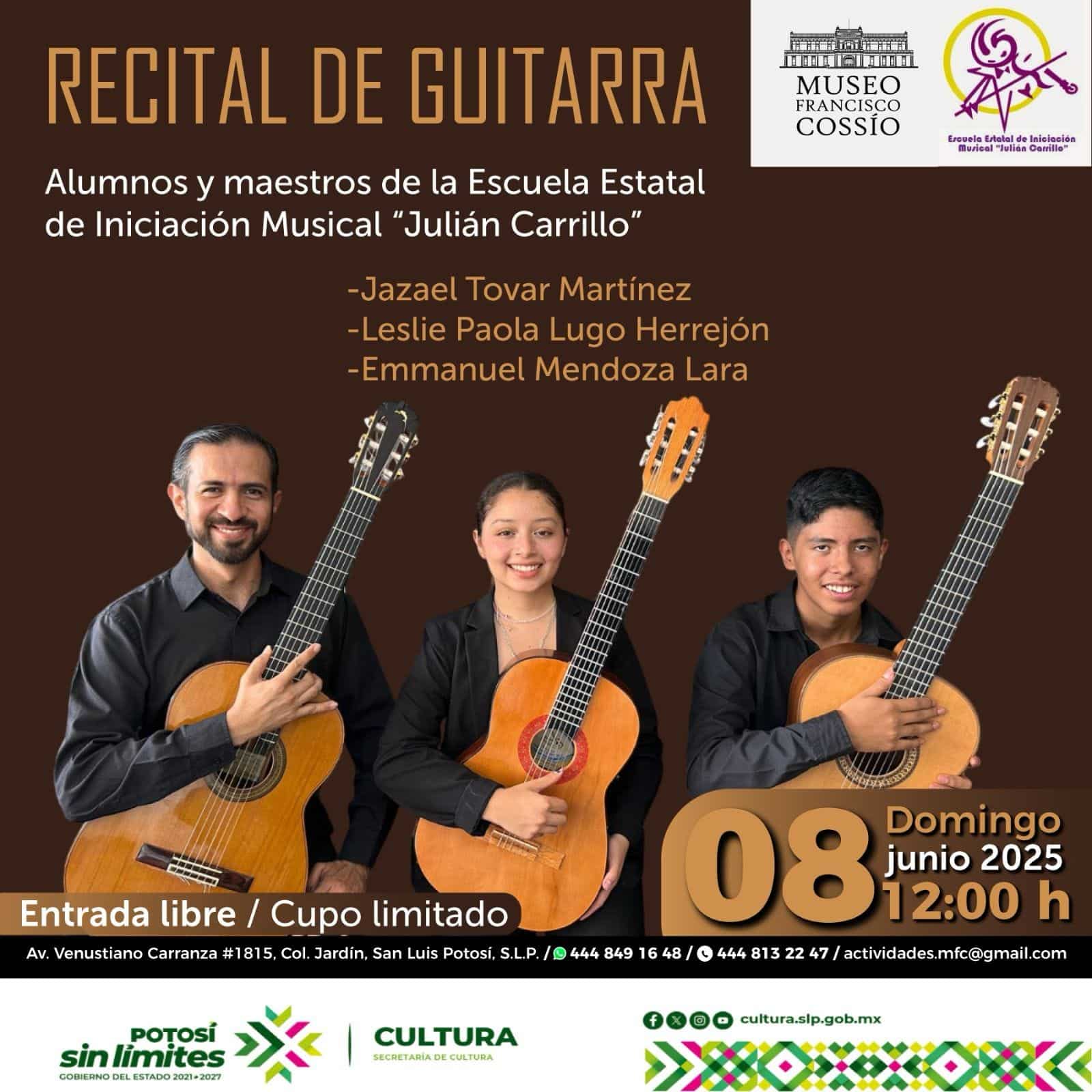 Este domingo 8 de junio a las 12:00 horas, el Museo Francisco Cossío abrirá sus puertas para ofrecer al público un recital de guitarra a cargo de talentosos integrantes de la Escuela Estatal de Iniciación Musical “Julián Carrillo” (EEDIM). La actividad, de entrada libre y con cupo limitado, es una excelente oportunidad para disfrutar del arte y la música en un entorno cultural de gran valor para San Luis Potosí.