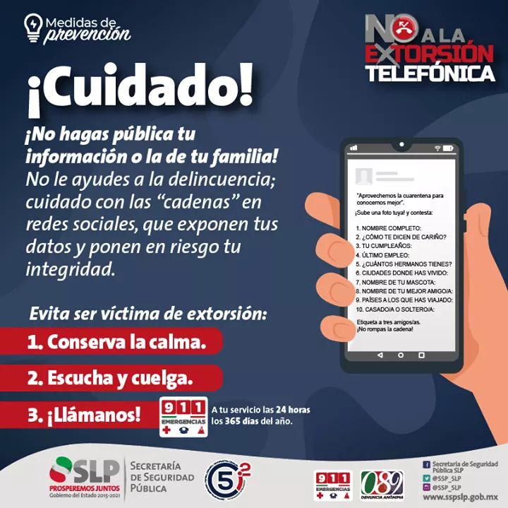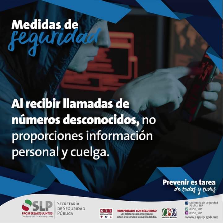 La Secretaría de Seguridad Pública del Estado (SSPE) exhorta a la población en general a evitar contestar llamadas de los números 487 144 98 60, 468 155 33 96, 429 697 51 97 y 444 207 64 19, e informa que ninguna corporación policial realiza llamadas telefónicas a particulares haciéndoles mención que han cometido algún ilícito, si atienden llamadas donde indiquen que están en peligro o o han hecho mal uso de su línea telefónica, cuelguen inmediatamente y reporten a la línea de emergencia 9-1-1 o 089 Denuncia Anónima.