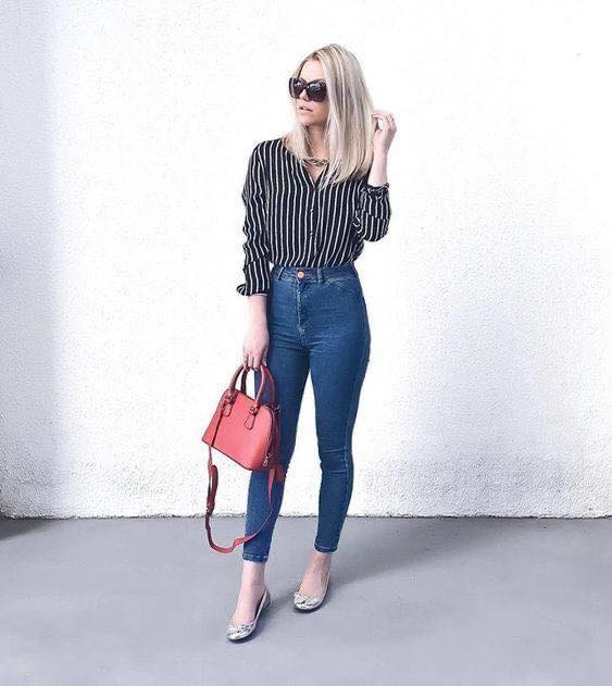 Un pantalón azul clásico con una blusa de cuello a rayas, dependiendo de los gustos de cada quien, puedes utilizar la blusa fajada o suelta.