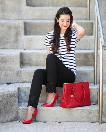 Esta es una de las grandes combinaciones que las prendas a rayas ofrece una blusa básica a rayas con pantalón negro y unas zapatillas rojas.