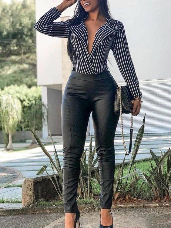 Si eres de las mujeres maduras pero sexys, este atuendo te quedará como anillo al dedo es una pantiblusa a rayas verticales y un pantalón de cuero negro y zapatillas negras. Podrías usar una bolsa pequeña para lucir espectacular.