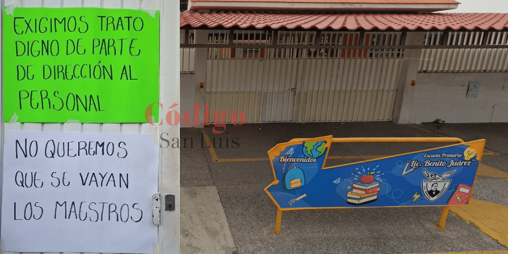 La mañana de este lunes, madres y padres de familia realizaron una manifestación en las inmediaciones de la escuela Benito Juárez, ubicada en la colonia Himno Nacional Primera Sección, en la capital potosina, para denunciar presuntas irregularidades en la gestión del plantel que han derivado en la ausencia de docentes.