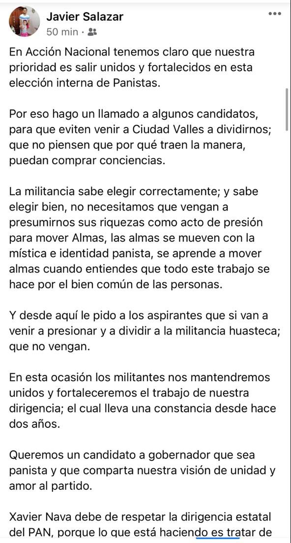 «En Acción Nacional tenemos claro que nuestra prioridad es salir unidos y fortalecidos en esta elección interna de los panistas. Por eso hago un llamado a algunos candidatos para que eviten venir a Ciudad Valles a dividirnos; que no piensen que porque traen la manera, puedan comprar conciencias. La militancia sabe elegir correctamente y sabe elegir bien. No necesitamos que vengan a presumirnos sus riquezas como acto de presión para mover almas. Las almas se mueven con la mística e identidad panista, se aprende a mover almas cuando entiendes que todo este trabajo se hace por el bien común de las personas» sostuvo.