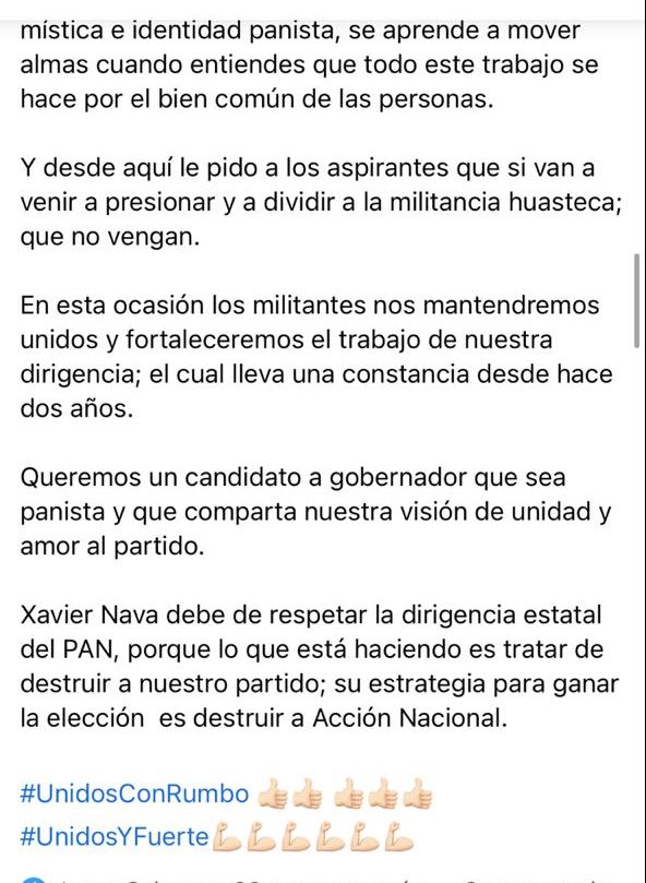 “Queremos un candidato a gobernador que sea panista y que comparta nuestro visión de unidad y amor al partido”, y adelantó que los militantes se mantendrán unidos y fortaleceremos el trabajo de nuestra dirigencia; el cual lleva una constancia desde hace dos años. Xavier Nava debe respetar a la dirigencia estatal del PAN, por lo que está haciendo es tratar de destruir de destruir a nuestro partido, esa es su estrategia para ganar la elección”.