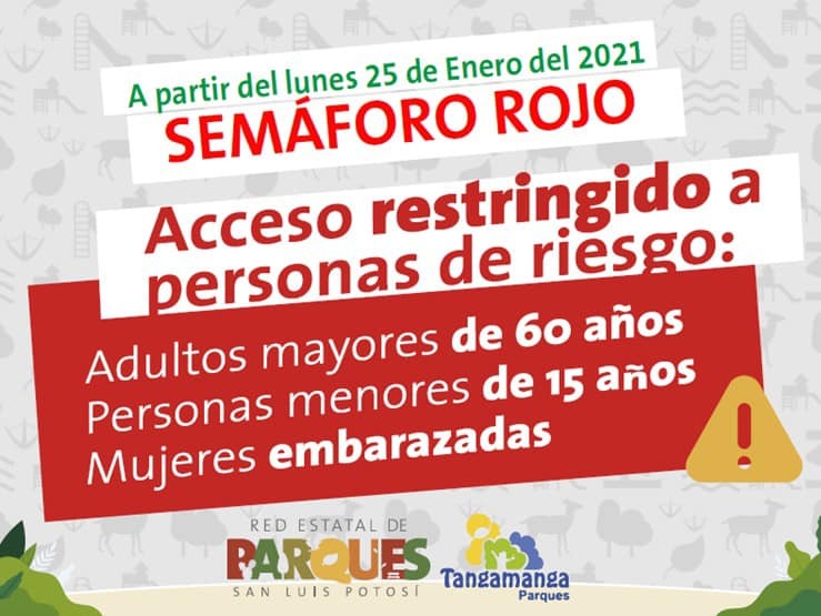 La Dirección General de los Parques Tangamanga informó que, ante el regreso de San Luis Potosí a color rojo en el semáforo de riesgo epidemiológico, se reforzarán las restricciones a partir del lunes 25 de enero de 2021 en atención a las disposiciones de las Secretarías de Salud de los gobiernos federal y del estado, con la intención de disminuir los contagios de Covid-19 en los centros recreativos, deportivos y culturales de la entidad.