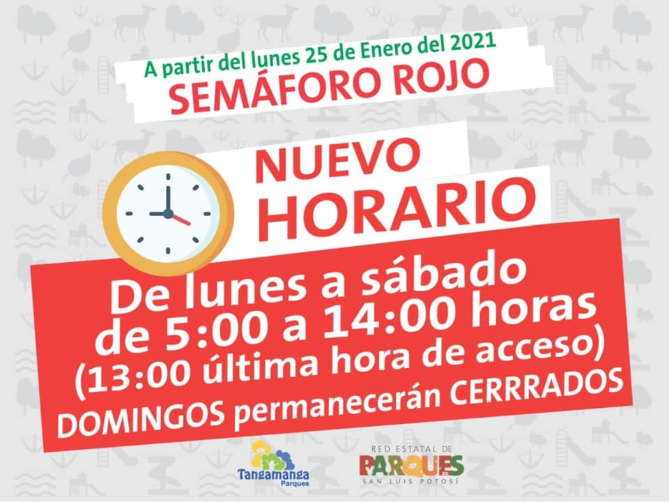 Las medidas restrictivas aplicarán para los parques urbanos y regionales de la Red Estatal de Parques: Tangamanga I y II de la capital, Tantocob de Ciudad Valles y Azahares de Rioverde que tendrán servicio con un aforo del 20 por ciento, de las 05:00 a las 14:00 horas, siendo a las 13:00 horas el último acceso para considerar 1 hora para la desocupación de lunes a sábado; los domingos todos permanecerán cerrados.