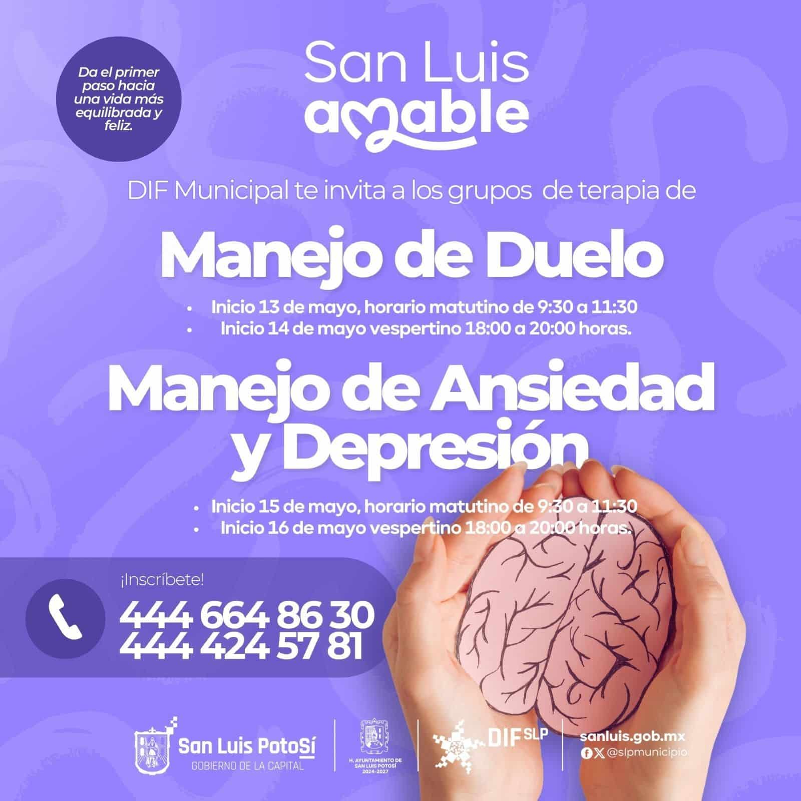 El DIF Municipal de San Luis Potosí informa a la ciudadanía que las terapias grupales para el manejo de ansiedad y depresión, y procesos de duelo, anunciadas recientemente, se reprogramaron, por lo que aún hay oportunidad de participar.