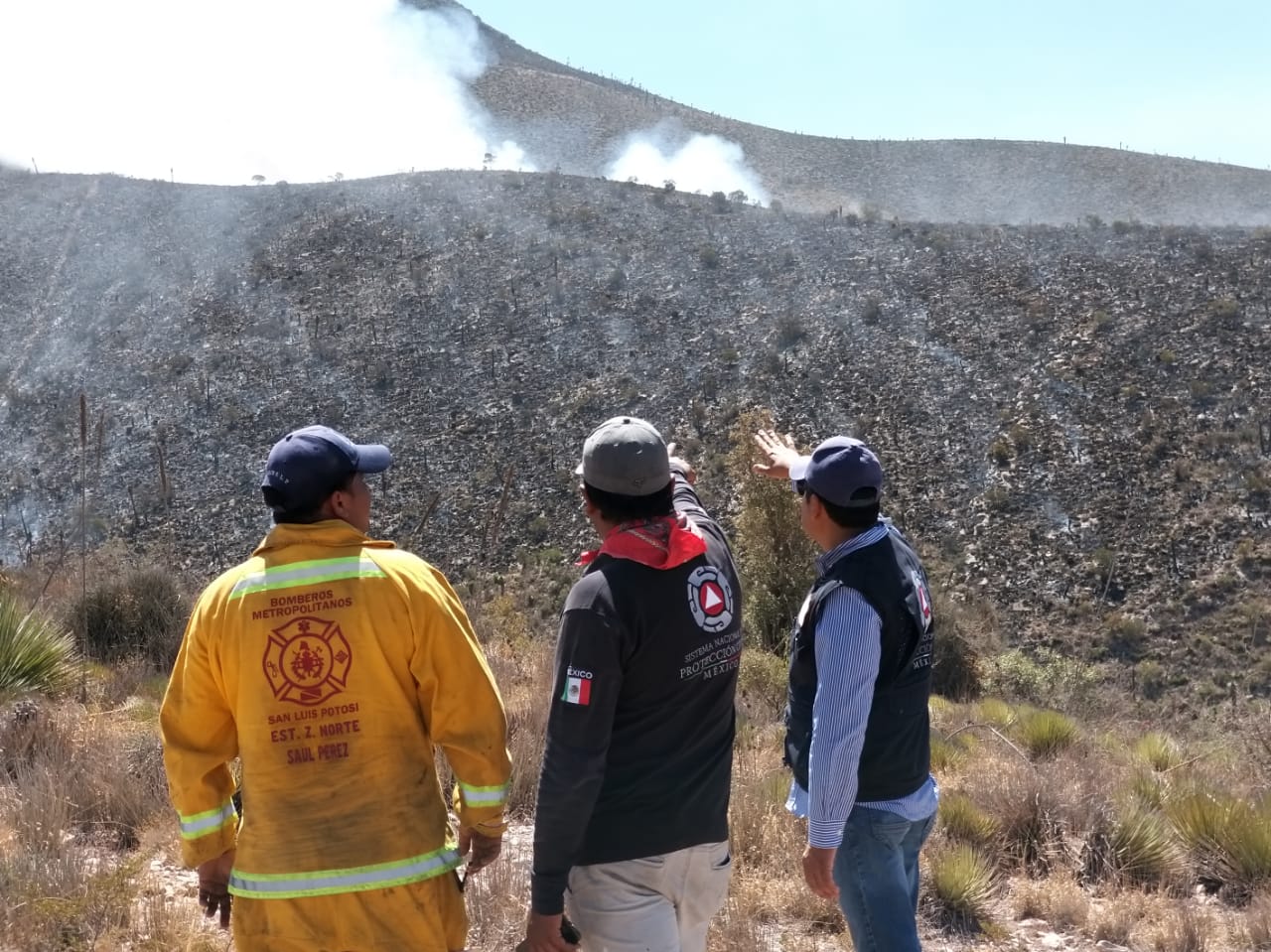 El incendio se registra en los límites del municipio de Cerro de San Pedro, Soledad y Armadillo de los Infante, donde el fuego ha dejado afectaciones a la vegetación de la zona, por lo que de manera coordinada las instancias participantes realizan labores de extinción de las llamas y labores preventivas.