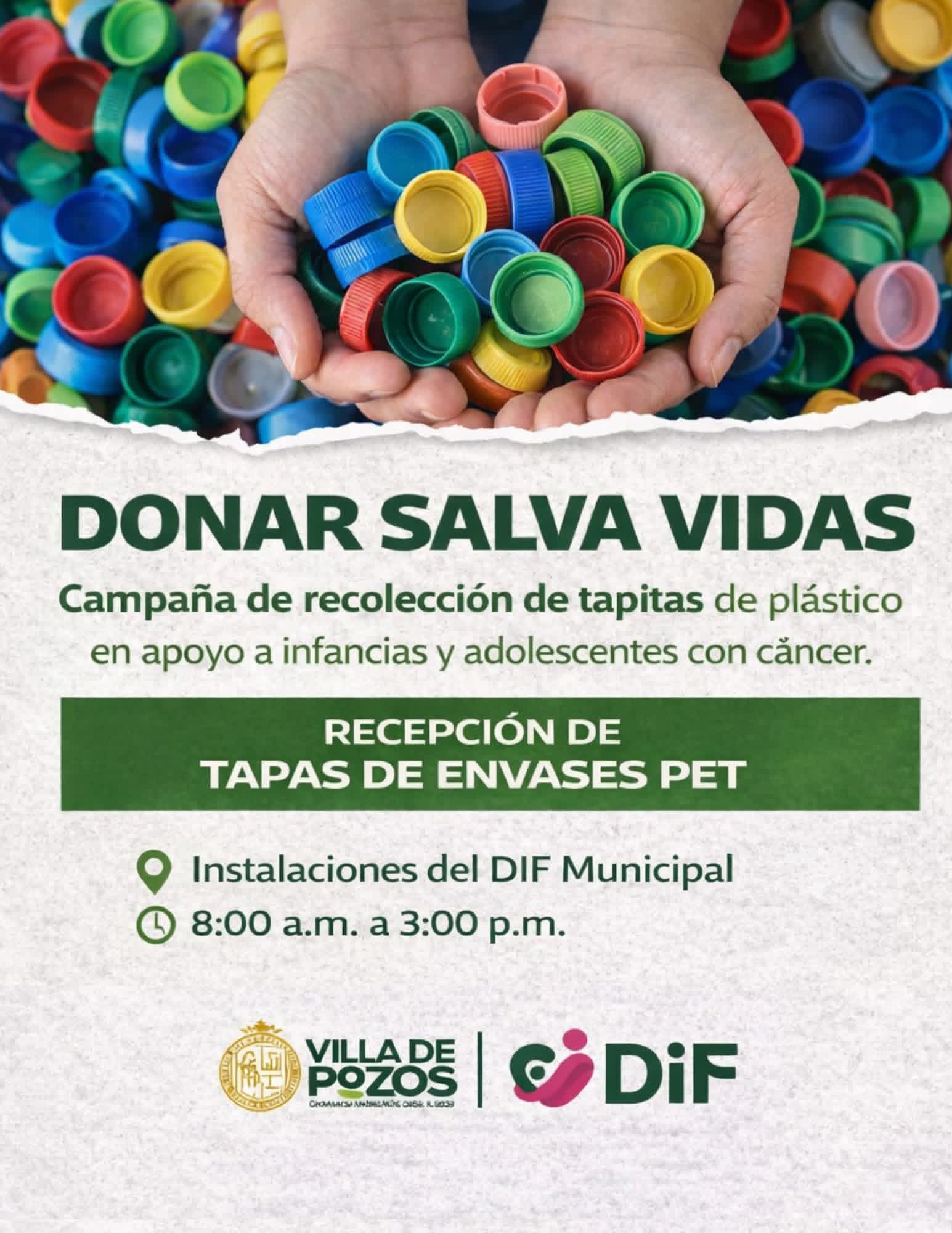 El Gobierno Municipal de Villa de Pozos, a través del Sistema Municipal DIF de Villa de Pozos, invita a la población a apoyar en la Campaña de Recolección de Tapitas de Plástico, una acción solidaria con el propósito de brindar apoyo a infancias y adolescentes que enfrentan el cáncer.